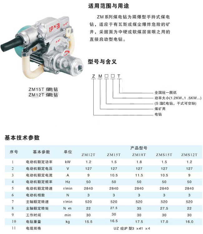 ZM12/15隔爆強(qiáng)力煤電鉆這種電鉆是全國(guó)正規(guī)廠家生產(chǎn)的統(tǒng)一型號(hào)。該鉆具有壽命長(zhǎng),轉(zhuǎn)矩大的優(yōu)點(diǎn)。ZMS12/15隔爆型濕冷式煤電鉆這種電鉆是采用在鉆孔時(shí)注水降塵并能夠防止鉆頭磨損的手持式電鉆。該鉆在鉆孔時(shí)需配有水源,干變或綜保。ZM15型煤電鉆 ZM12型煤電鉆(分為干式 濕式)ZMS12表示1.2kW濕式煤電鉆 ZM15Q表示1.5kW干式強(qiáng)力煤電鉆,煤礦井下在硬煤和軟層中作鉆眼用的手持式鉆機(jī),具有礦用隔爆結(jié)構(gòu)和注水裝置,可以安全用于甲烷與煤塵爆炸危險(xiǎn)的礦井。