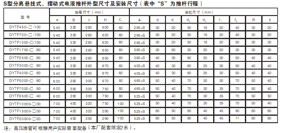 - DTYF型分離式電液推桿是一種集機(jī)、電、液為一體的液壓驅(qū)動(dòng)機(jī)械手,適用于需要往復(fù)推拉直線(或往復(fù)旋轉(zhuǎn)一定角度)運(yùn)動(dòng),也可用于需要上升、下降或夾緊工作物的場(chǎng)所,并可實(shí)現(xiàn)遠(yuǎn)距離危險(xiǎn)地區(qū)的集中或自動(dòng)控制。已廣泛應(yīng)用于冶金、礦山、電力、煤炭、機(jī)械、交通、糧食、化工、水泥、水利、建材、運(yùn)輸?shù)炔块T,是一種通用的動(dòng)力源。電液推桿是一種機(jī)、電、液一體化的新型柔性傳動(dòng)機(jī)構(gòu),它以執(zhí)行機(jī)構(gòu)(油缸)、控制機(jī)構(gòu)(液壓控制閥組)和動(dòng)力源(油泵電機(jī)等到)組成。根據(jù)現(xiàn)場(chǎng)安裝空間及用戶使用情況電液推桿可有多種結(jié)構(gòu)形式(具體見(jiàn)電液推桿外形尺寸圖,也可根據(jù)用戶要求定制樣式)。電動(dòng)機(jī)通過(guò)正反轉(zhuǎn)驅(qū)動(dòng)雙向液壓泵正反輸出壓力油,經(jīng)液壓控制閥送至油缸,也實(shí)現(xiàn)活塞桿的往復(fù)運(yùn)動(dòng)。液壓控制閥組主要由溢流閥,吸油單向閥,調(diào)速閥(用戶要求),液控單向閥(液壓鎖)等組成也可根據(jù)電液推桿的工作特性,設(shè)計(jì)不同功能的油路組合閥,滿足其工作要求。一般有推出自鎖,拉回自鎖和推拉均自鎖;運(yùn)行速度有可調(diào)速型,不可調(diào)速型;電液推桿工作角度有水平推,向上推(包括斜向上),向下推(包括斜向下)等幾種。電液推桿主要有以下優(yōu)點(diǎn):(1)結(jié)構(gòu)緊湊、安裝方便、占據(jù)空間小、維護(hù)簡(jiǎn)單。(2)可帶負(fù)荷起動(dòng),具有過(guò)載保護(hù)功能。(3)回路設(shè)雙向液壓鎖,可停在規(guī)定行程范圍內(nèi)的任意位置并自鎖,且保持輸出力不變。(4)推拉力,速度(用戶要求)無(wú)級(jí)可調(diào),驅(qū)動(dòng)力范圍極廣。(5)因故斷電,推桿自鎖,避免發(fā)生事故。(6)采用全液壓傳動(dòng),動(dòng)作靈敏,運(yùn)行平穩(wěn),能有效緩沖外來(lái)沖擊力,行程控制精確(≥0.5mm)(7)機(jī)電液一體化全封閉結(jié)構(gòu),工作油路循環(huán)于無(wú)壓的封閉鋼筒里,體積小,不滲油,在惡劣的工作環(huán)境下,不吸塵,不進(jìn)水,內(nèi)部不銹蝕,使用壽命長(zhǎng)。DTYF型分離式電液推桿是我公司成立前針對(duì)國(guó)內(nèi)中,大推力檔電動(dòng)拉桿產(chǎn)品空白,而顧客又有需求的情況下于1988年起率先自主開(kāi)發(fā)并獨(dú)家生產(chǎn)的系列產(chǎn)品,是我公司多種電動(dòng)推拉桿系列產(chǎn)品之一。該產(chǎn)品已在首鋼,包鋼等多家大鋼鐵企業(yè)推廣應(yīng)用,也可用于其他需要大推,拉力的場(chǎng)合。其使用條件為環(huán)境溫度-15℃-60℃,相對(duì)濕度≤85%。DTYF型分離式電液推桿由驅(qū)動(dòng)電機(jī),減速器,滑動(dòng)螺旋傳動(dòng)機(jī)構(gòu)等主要部分組成。內(nèi)部設(shè)有彈簧緩沖機(jī)構(gòu)及超載保護(hù)裝置,可保證產(chǎn)品安全,可靠地運(yùn)行。DTYF型分離式電液推桿的性能參數(shù),外形及安裝尺寸符合《Q/320211AKA01-2000電動(dòng)推拉桿》企業(yè)標(biāo)準(zhǔn)的規(guī)定,其具體數(shù)據(jù)表列如下。