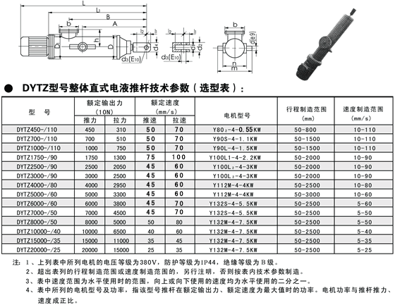 - DYTZ型整體式電液推桿是一種集機(jī)、電、液為一體的液壓驅(qū)動機(jī)械手,適用于需要往復(fù)推拉直線(或往復(fù)旋轉(zhuǎn)一定角度)運(yùn)動,也可用于需要上升、下降或夾緊工作物的場所,并可實現(xiàn)遠(yuǎn)距離危險地區(qū)的集中或自動控制。DYTZ型整體式電液推桿廣泛應(yīng)用于冶金、礦山、電力、煤炭、機(jī)械、交通、糧食、化工、水泥、水利、建材、運(yùn)輸?shù)炔块T,是一種通用的動力源。DYTZ型整體式電液推桿是一種機(jī)、電、液一體化的新型柔性傳動機(jī)構(gòu),它以執(zhí)行機(jī)構(gòu)(油缸)、控制機(jī)構(gòu)(液壓控制閥組)和動力源(油泵電機(jī)等到)組成。根據(jù)現(xiàn)場安裝空間及用戶使用情況電液推桿可有多種結(jié)構(gòu)形式(具體見電液推桿外形尺寸圖,也可根據(jù)用戶要求定制樣式)。電動機(jī)通過正反轉(zhuǎn)驅(qū)動雙向液壓泵正反輸出壓力油,經(jīng)液壓控制閥送至油缸,也實現(xiàn)活塞桿的往復(fù)運(yùn)動。液壓控制閥組主要由溢流閥,吸油單向閥,調(diào)速閥(用戶要求),液控單向閥(液壓鎖)等組成也可根據(jù)電液推桿的工作特性,設(shè)計不同功能的油路組合閥,滿足其工作要求。一般有推出自鎖,拉回自鎖和推拉均自鎖;運(yùn)行速度有可調(diào)速型,不可調(diào)速型;電液推桿工作角度有水平推,向上推(包括斜向上),向下推(包括斜向下)等幾種。電液推桿主要有以下優(yōu)點:(1)結(jié)構(gòu)緊湊、安裝方便、占據(jù)空間小、維護(hù)簡單。(2)可帶負(fù)荷起動,具有過載保護(hù)功能。(3)回路設(shè)雙向液壓鎖,可停在規(guī)定行程范圍內(nèi)的任意位置并自鎖,且保持輸出力不變。(4)推拉力,速度(用戶要求)無級可調(diào),驅(qū)動力范圍極廣。(5)因故斷電,推桿自鎖,避免發(fā)生事故。(6)采用全液壓傳動,動作靈敏,運(yùn)行平穩(wěn),能有效緩沖外來沖擊力,行程控制精確(≥0.5mm)(7)機(jī)電液一體化全封閉結(jié)構(gòu),工作油路循環(huán)于無壓的封閉鋼筒里,體積小,不滲油,在惡劣的工作環(huán)境下,不吸塵,不進(jìn)水,內(nèi)部不銹蝕,使用壽命長。DYTZ型整體式電液推桿是我公司成立前針對國內(nèi)中,大推力檔電動拉桿產(chǎn)品空白,而顧客又有需求的情況下于1988年起率先自主開發(fā)并獨家生產(chǎn)的系列產(chǎn)品,是我公司多種電動推拉桿系列產(chǎn)品之一。該產(chǎn)品已在首鋼,包鋼等多家大鋼鐵企業(yè)推廣應(yīng)用,也可用于其他需要大推,拉力的場合。其使用條件為環(huán)境溫度-15℃-60℃,相對濕度≤85%。DYTZ型整體式電液推桿由驅(qū)動電機(jī),減速器,滑動螺旋傳動機(jī)構(gòu)等主要部分組成。內(nèi)部設(shè)有彈簧緩沖機(jī)構(gòu)及超載保護(hù)裝置,可保證產(chǎn)品安全,可靠地運(yùn)行。DYTZ型整體式電液推桿的性能參數(shù),外形及安裝尺寸符合《Q/320211AKA01-2000電動推拉桿》企業(yè)標(biāo)準(zhǔn)的規(guī)定,其具體數(shù)據(jù)表列如下。