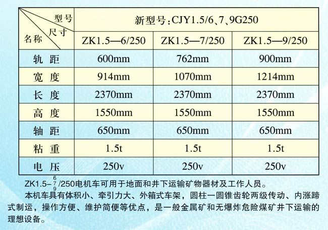 原型號ZK3-6、7、9/250-2型電機(jī)車主要技術(shù)參數(shù)
