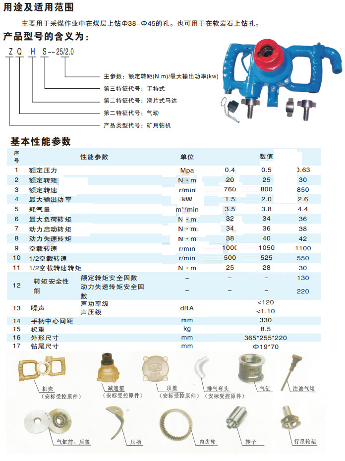 ZQHS-25/1.9(ZQHS-25/2.0)氣動手持式鉆機(jī)主要技術(shù)參數(shù):
